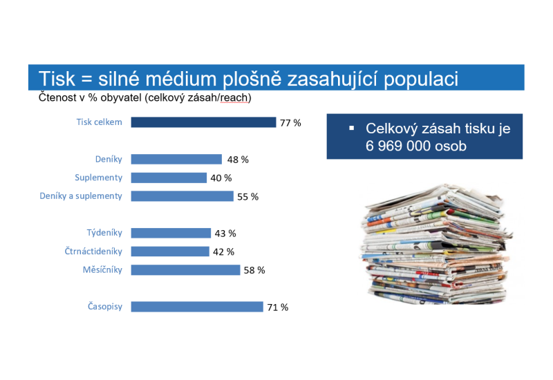 Nejnovější výsledky jednotného výzkumu čtenosti periodického tisku MEDIA PROJEKT za období od třetího čtvrtletí 2024 do druhého čtvrtletí 2025 byly předány a zveřejněny ve čtvrtek 14. 8. 2025 v Presscentru ČTK. Printové tituly dosáhly i za toto období opět průměrného zásahu 77 % české populace ve věku 12 až 79 let, což představuje 6,969.000 osob. Tisk je stabilním a silným médiem, protože ve stejném období 12 měsíců, jako jsou výsledky MEDIA PROJEKTU, bylo prodáno více než 86 milionů jednotlivých výtisků deníků a více než 64 milionů výtisků časopisů (období 1. 7. 2024 – 30. 6. 2025, zdroj: auditem ověřená data ABC ČR).