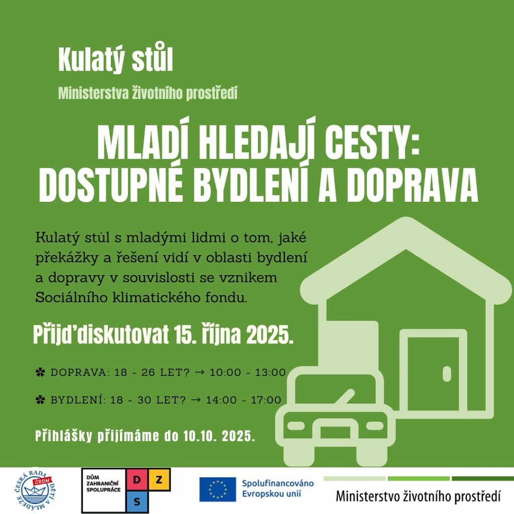 Strukturovaný dialog mládeže hledá mladé lidi (18–30) z celé ČR! Jaké překážky řeší mladí lidé v oblasti bydlení a dopravy? A jaká by mohla být řešení? Přijď to s námi probrat na kulatý stůl Ministerstva životního prostředí v souvislosti se vznikem Sociálního klimatického fondu!