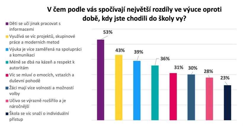 Z průzkumu mezi rodiči základních a středních škol vyplynulo, že vnímají, že se život v lavicích oproti jejich školním letům změnil. Více než polovina si všímá, že děti dnes jinak pracují s informacemi, dvě pětiny zaznamenaly větší důraz na projekty a moderní metody a více než třetina oceňuje posun ke spolupráci a komunikaci. Každý třetí rodič navíc vnímá, že školy častěji otevírají témata emocí, vztahů a duševní pohody, a že žáci mají více volnosti i možností volby.